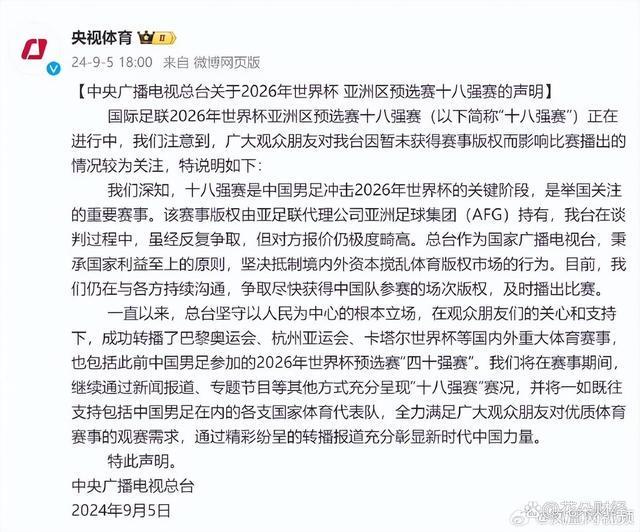 早一些时候,有不少球迷、网友好奇讨论“央视cctv5为何不转播国足”,随着讨论的深入,去年9月5日,央视一则声明浮出水面。“央视体育”当时表示:“我们深知,十八强赛是中国男足冲击2026年世界杯的关键阶段,是举国关注的重要赛事。该赛事版权由亚足联代理公司亚洲足球集团(AFG)持有,我台在谈判过程中,虽经反复争取,但对方报价仍极度畸高。总台作为国家广播电视台,秉承国家利益至上的原则,坚决境内外资本搅乱体育版权市场的行为。目前,爱游戏ayx我们仍在与各方持续沟通,争取尽快获得中国队参赛的场次版权,及时播出比赛。”