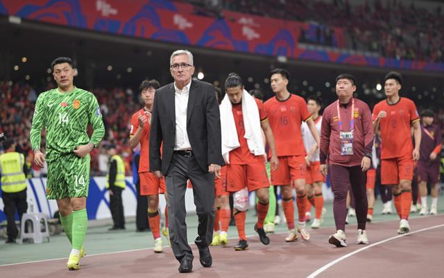 2025年3月25日,中国队主教练伊万科维奇(前右)与球员在比赛后。 当日,在浙江杭州举行的2026美加墨世界杯亚洲区预选赛18强赛C组第八轮比赛中,中国队主场0比2不敌澳大利亚队。 新华社记者 江汉 摄